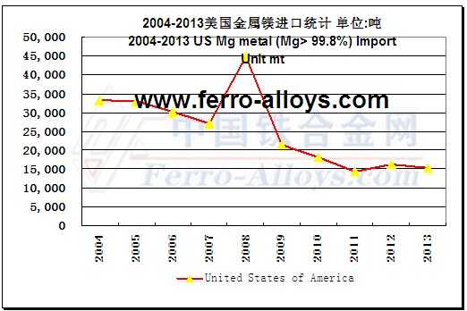 2004-2013���������V��Mg99.8%���ϣ��M(j��n)�ڽy(t��ng)Ӌ 2004-2013 US Mg Metal (Mg>99.8%) Import Statistic